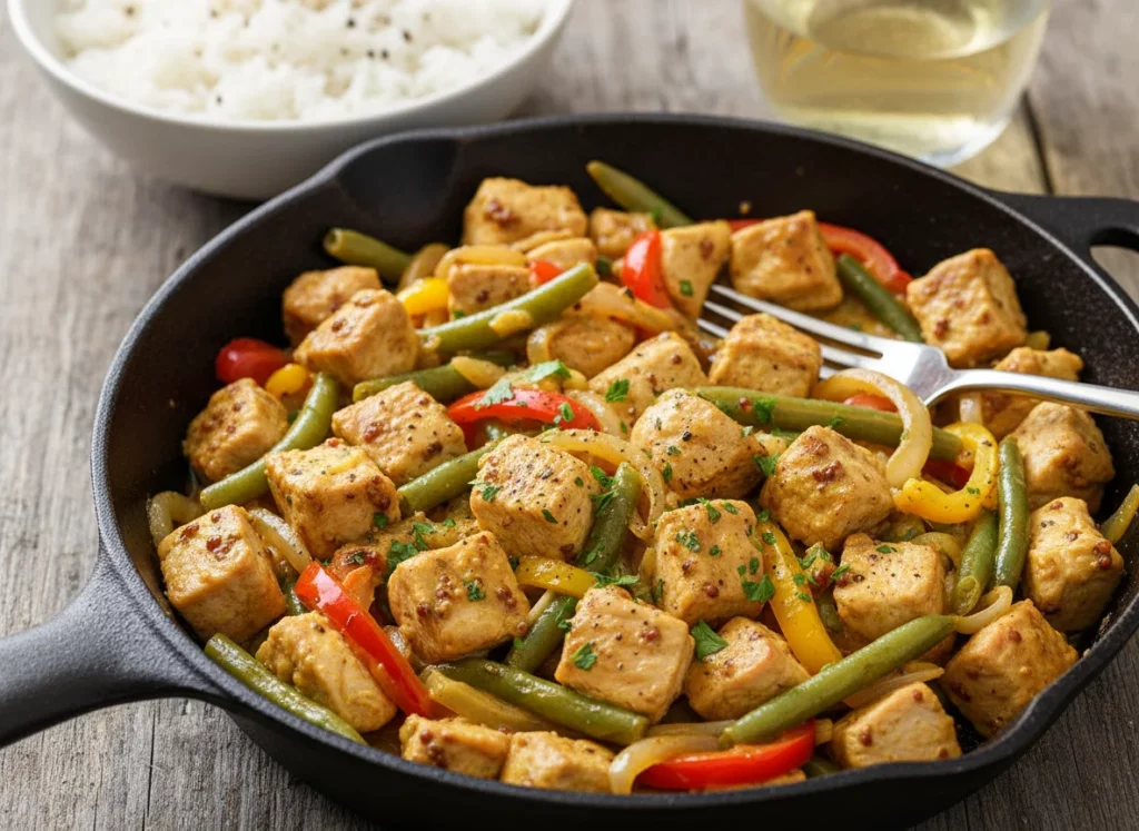 ─ Le sauté de dinde à la moutarde est une préparation culinaire qui consiste à faire sauter des morceaux de dinde dans une sauce onctueuse à base de moutarde, Cette combinaison de saveurs crée un plat équilibré et savoureux qui peut être servi avec des accompagnements tels que des légumes, du riz, ou des pommes de terre.